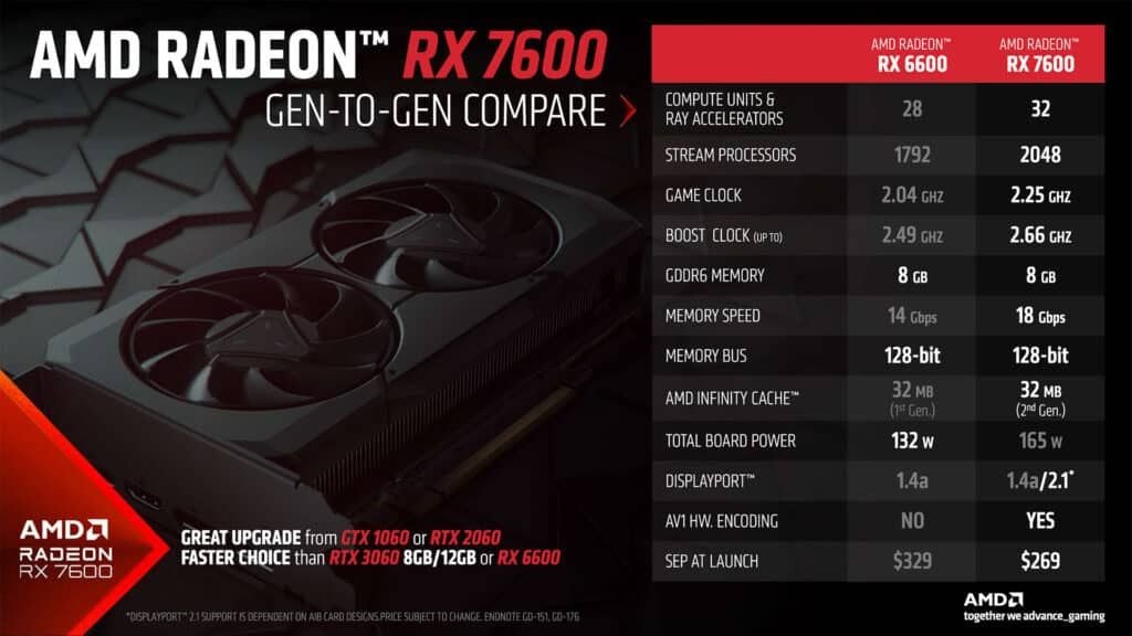 Η RX 7600 έρχεται εξοπλισμένη με 8GB GDDR6 μνήμης στα 18Gbps έναντι 14ων της RX 6600, με 128Bit memory bus, 32 CU (compute units), κατέχει περισσότερους πυρήνες, συγκεκριμένα φτάνοντας τους 2048 έναντι 1792, game clock 2.25GHz / έως 2.66GHz boost Core clock, υποστηρίζει το νέο codec πρότυπο AV1 και τις όποιες Ray Tracing βελτιώσεις φέρνει η νέα RDNA3 αρχιτεκτονική, ενώ διαθέτει και το νέο πρότυπο εξόδου εικόνας Display Port 2.1 (αναλόγως την aftermarket υλοποίηση).