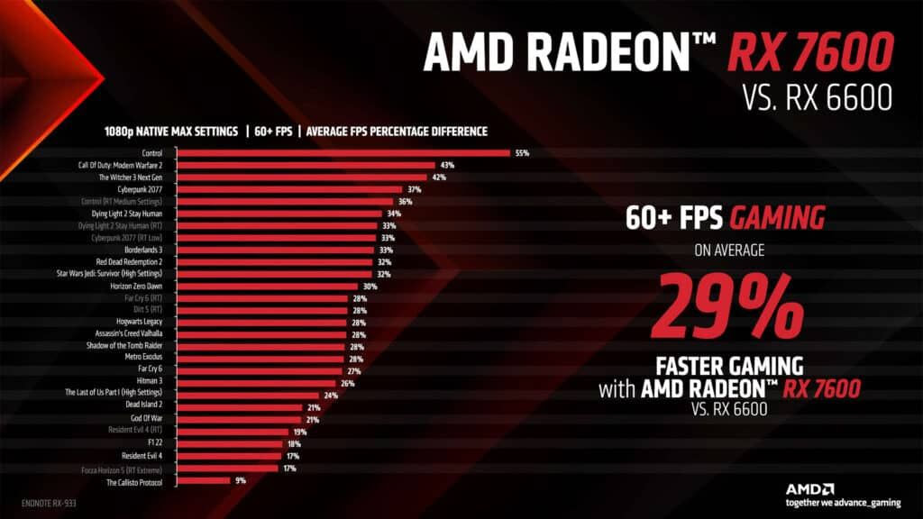 Συγκρίνοντας την με δημοφιλείς κάρτες της μεσαίας κατηγορίας όπως τις GTX 1060 6GB, RTX 2060 6GB και τον ακριβότερο προκάτοχό της, RX 6600 (με $329 MSRP), η εταιρεία υπόσχεται όπως βλέπετε και στο πινακάκι παρακάτω, ότι η νέα RX 7600 αποτελεί μια υπολογίσιμη και ιδανική λύση αναβάθμισης για όσους δεν κυνηγούν τόσο τις κορυφαίες επιδόσεις σε μεγάλες αναλύσεις ούτε επιθυμούν να τερματίσουν όλες τις διαθέσιμες επιλογές γραφικών στον κάθε νέο τίτλο.