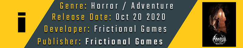 Η Frictional Games ιδρύθηκε το 2007 στο Malmö της Σουηδίας. Τα δυο πρώτα χρόνια της λειτουργίας της ασχολήθηκε με την ανάπτυξη τριών παιχνιδιών και expansions υπό το όνομα Penumbra τα οποία δεν εξέλαβαν την προσδοκώμενη, κατά τους δημιουργούς, απήχηση. Ωστόσο η επιτυχία ήρθε το 2010 με την κυκλοφορία του Amnesia: The Dark Descent, ενός παιχνιδιού τρόμου- επιβίωσης πρώτου προσώπου, όπου έχοντας ως άξονα την διατήρηση της ψυχικής υγείας του πρωταγωνιστή κατόρθωσε μέσω ενός απλοϊκού gameplay αναζήτησης φωτεινών πηγών, να μεταδώσει περίτεχνα το αίσθημα του τρόμου. Η απήχηση που έλαβε τόσο το ίδιο το παιχνίδι όσο και τα “ιστορικά”, κατά μια έννοια, “Let’s play” videos με αυτό, οδήγησαν το στούντιο να αποφασίσει την συνέχεια της σειράς. Όμως τα μέλη της Frictional Games διαισθάνονταν πως αν επιχειρούσαν οι ίδιοι κάτι τέτοιο, θα αποτύγχανε παταγωδώς. Έτσι “προσέλαβαν” την The Game Kitchen για την ανάπτυξη αυτού του εγχειρήματος, ενώ οι ίδιοι ανέλαβαν συμβουλευτικό ρόλο, αλλά και την δημοσίευση του. Το αποτέλεσμα ήταν το Amnesia: A Machine for Pigs, ένα παιχνίδι με σαφέστερη εστίαση στην ιστορία και την ατμόσφαιρα του, το οποίο ωστόσο παρέβλεπε θεμελιώδη χαρακτηριστικά που προσδιόριζαν τον προγενέστερο τίτλο, χάνοντας για πολλούς την ταυτότητα των Amnesia. Επτά χρόνια μετά και έχοντας έναν μεγαλύτερης κλίμακας τίτλο στο ενεργητικό της εν ονόματι Soma (2015), η Frictional Games επιστρέφει εκ νέου στο franchise του Amnesia και μένει να δούμε πως διαχειρίζεται όλο αυτό το βάρος που φέρει ενώ παράλληλα απευθύνεται σε νέο, σύγχρονο κοινό.