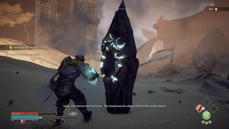 Το Gauntlet έχει διάφορες ικανότητες, με μια από αυτές να είναι το sandglide ή πιο απλά το σερφάρισμα πάνω στην άμμο. Έτσι, μετακινούμαστε στον χάρτη με αρκετά μεγάλη ευκολία και ταχύτητα ενώ οι επιπρόσθετες λειτουργίες του όπως το Air Dash, Evade και Double Jump μας δίνουν περισσότερες εναλλακτικές στην περιπλάνησή μας. Μαζί με τα traversal skills, μπορούμε να ξεθάψουμε και αμόνια, που χρησιμεύουν ως σημεία Fast Travel, πάγκους αναβαθμίσεων και ένα μέρος όπου μπορούμε να αποθηκεύσουμε την πρόοδό μας ή για να γιατρευτούμε.