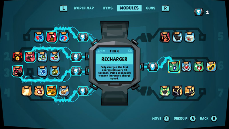 Ορισμένα από τα εργαλεία που έχουμε χρειάζονται ενέργεια για να λειτουργήσουν, ενέργεια που εμφανίζεται ως μπαταρία κάτω από την ζωή μας. Τόσο η ζωή μας όσο και η ενέργεια μπορούν να επεκταθούν βρίσκοντας και μαζεύοντας κομμάτια καρδιάς και μπαταρίας αντίστοιχα – κάτι που θα μας θυμίσει Zelda.