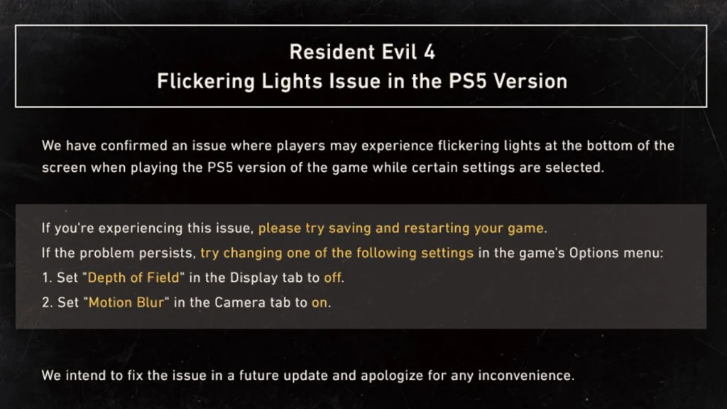 «Είμαστε ενήμεροι για ένα πρόβλημα όπου οι παίκτες μπορεί να αντιμετωπίσουν flickering στο κάτω μέρος της οθόνης τους ενώ παίζουν την έκδοση PS5 του παιχνιδιού και έχουν επιλεγεί ορισμένες ρυθμίσεις», αναφέρει η κύρια ανακοίνωση της Capcom ακριβώς παρακάτω δίχως να συγκεκριμενοποιεί ποιες είναι αυτές οι ρυθμίσεις.