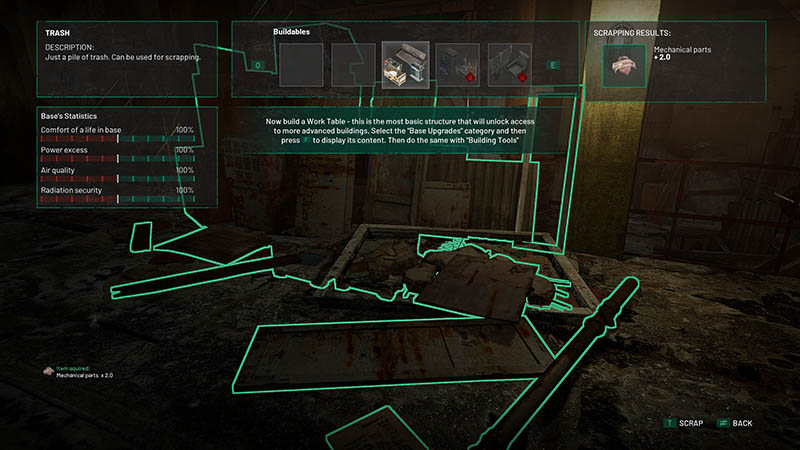 Στην τόσο πολυσυζητημένη ζώνη, υπάρχει κάτι που χρειάζεται ο Igor για να επιβιώσει και αυτό είναι πόροι. Μπορεί τα crafting και base building να είναι επίσης βασικοί μηχανισμοί του παιχνιδιού, όμως μη περιμένεις μεγάλη πληθώρα αντικειμένων. Για την ακρίβεια, οι πρώτες ύλες είναι χωρισμένες σε πολύ γενικευμένες κατηγορίες όπως μέταλλα, ηλεκτρονικά και καύσιμα… τα οποία χρησιμοποιούνται για την δημιουργία αντικειμένων πρώτης ανάγκης (φαγητό για παράδειγμα) και την εξέλιξη της βάσης. Το base building είναι παρόμοιο με αυτό του Fallout 4 & Fallout 76. Μπορείς να καταστρέψεις και να δημιουργήσεις διάφορα έπιπλα και πάγκους εργασίας, ενώ παράλληλα πρέπει να έχεις υπόψιν την άνεση των NPC και την ποιότητα του αέρα. Στην περίπτωση των όπλων, εξακολουθεί να υπάρχει λιτότητα. Στο Chernobylite υπάρχουν τέσσερα όπλα, ένα για κάθε ανάγκη. Συγκεκριμένα έχουμε ένα πιστόλι, μία καραμπίνα, ένα αυτόματο και ένα πιο “διαστημικό” όπλο. Τα όπλα, μπορείς να τα βελτιστοποιήσεις αλλάζοντας στοιχεία όπως γεμιστήρες, σκόπευτρα και τα συναφή.
