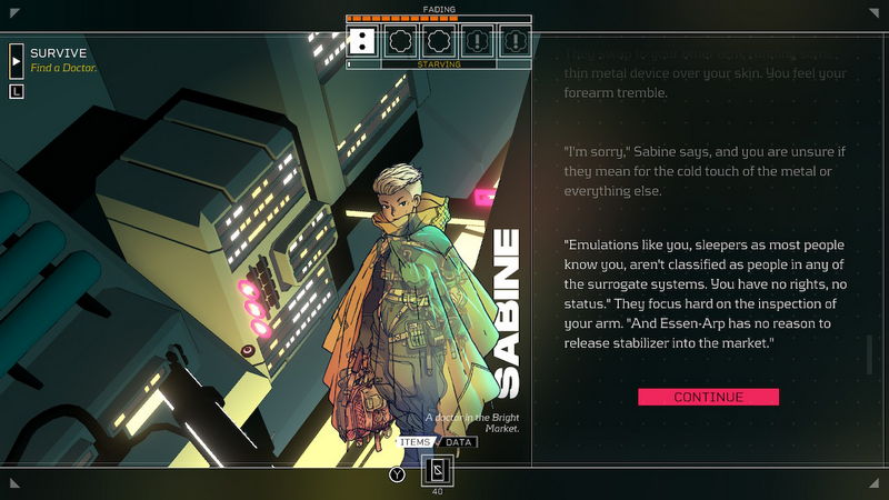 Οι ημέρες πάνω στον σταθμό ολοκληρώνονται σε κύκλους. Για να τελειώσει ένας κύκλος πρέπει να ξεκουραστείς στο καταφύγιό σου. Στο τελευταίο θα βρεθείς αφού ξοδέψεις όλες σου τις κινήσεις-ζαριές, είτε απλά αποφασίσεις ότι θες να προχωρήσεις στην επόμενη ημέρα για διάφορους λόγους, όπως π.χ. να επισπεύσεις γεγονότα. Ο χαρακτήρας μας αλληλεπιδρά με το περιβάλλον και τους χαρακτήρες λαμβάνοντας αποφάσεις και ξοδεύοντας κινήσεις που αποτελούνται από πέντε ζάρια. Όσο πιο μεγάλη η ζαριά τόσο μεγαλύτερα είναι τα περιθώρια επιτυχίας. Οι κουκίδες των ζαριών, ωστόσο, ανανεώνονται τυχαία και μετά από ξεκούραση στον προσωπικό σου χώρο. Παράλληλα, διαθέτεις δύο μπάρες αυτές των condition και energy, με την πρώτη να αντιπροσωπεύει το health σου και τη δεύτερη να επηρεάζει των αριθμό των κινήσεών σου με τα ζάρια. Θέλει ιδιαίτερη προσοχή γιατί αυτά τα δύο στοιχεία μειώνονται με το παραμικρό, ακόμα και με τον ύπνο στο τέλος του κύκλου, και απαιτείται πρόνοια προμήθειας rations και άλλων σημαντικών αναλώσιμων. Είναι θέμα χρόνου να βρείτε την ισορροπία και πραγματικά θα οξύνει τη φαντασία και τον νου σας. Όσο προχωράτε στο παιχνίδι αναλαμβάνοντας quests, θα γνωρίζετε νέους χαρακτήρες, θα βρεθείτε μπροστά σε ηθικά διλήμματα, θα χακάρετε τερματικά, θα επικηρυχθείτε και άλλα πολλά. Κάθε σας απόφαση οδηγεί σε διαφορετική τροπή των καταστάσεων και αυτό είναι ένα από τα πιο γοητευτικά στοιχεία του παιχνιδιού. Χωρίς να υπάρχει σωστό ή λάθος, μια απόφαση θα σας οδηγήσει σε απροσδόκητες εξελίξεις και ανατροπές. Τέλος, ο χαρακτήρας σας έχει τη δυνατότητα να περιηγείται σε ένα είδος «dark web» από το οποίο αλιεύει πληροφορίες και προσθήκες τις οποίες και χρησιμοποιεί για να ξεκλειδώσει στον υλικό κόσμο νέες περιοχές, επιλογές και δυνατότητες.