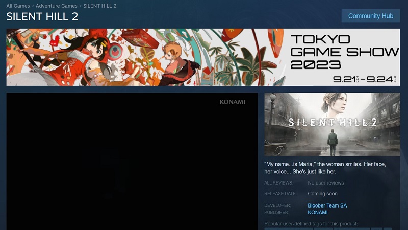 Όπως όλα δείχνουν υπάρχει μεγάλη πιθανότητα το remake του Silent Hill 2 να προβληθεί ξανά πολύ σύντομα, κρίνοντας από ορισμένα πρόσφατα ευρήματα που εθεάθησαν στο Steam. Συγκεκριμένα στη σελίδα Steam του παιχνιδιού εμφανίστηκε ένα banner Tokyo Game Show 2023, event το οποίο θα πραγματοποιηθεί την επόμενη εβδομάδα, από τις 21 Σεπτεμβρίου έως τις 24 Σεπτεμβρίου.
