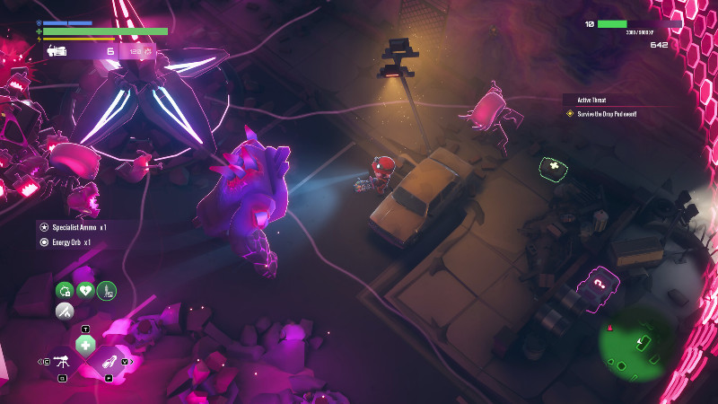 Τέλος, δεν θα μιλούσαμε για indie παιχνίδι αν δεν υπήρχαν ατέλειες σε γραφικά και ορισμένα από τα υπάρχουσα συστήματα. Ο χειρισμός μέσα στο inventory ήταν αρκετά περίεργος σε σημείο που νομίζαμε πως παίζαμε κάποιο minigame. Από την άλλη, τα γραφικά είναι ένας ακόμα εχθρός αφού τα σκοτεινά σοκάκια και γενικότερα οι πίστες έρχονται σε αντίθεση με τα εφέ, τα χρώματα των εξωγήινων και των πυρομαχικών από το όπλο μας. Τα neon χρώματα “χτυπάνε” αρκετά στο μάτι με αποτέλεσμα να χανόμαστε στον πανικό εκρήξεων και βολών. Φυσικά, δεν απουσιάζουν και αρκετά bugs και glitches που πολλές φορές μας σταματούν την ώρα της κίνησης με αποτέλεσμα να πεθαίνουμε πολλές φορές.