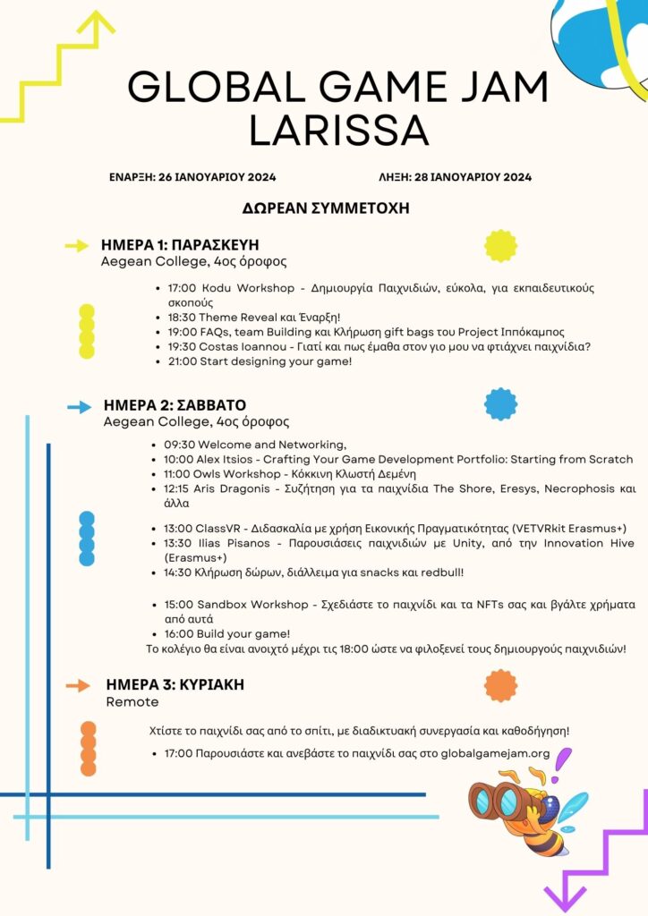 Τον Ιανουάριο του 2023, υπήρξαν 900 σημεία σε όλο τον κόσμο (σε 113 χώρες), και δημιουργήθηκαν 10.000 παιχνίδια σε ένα μόλις σαββατοκύριακο! Φέτος, το GGJ Larissa θα διεξαχθεί στον 4ο όροφο του Aegean College (το οποίο υποστηρίζει και φιλοξενεί τη διοργάνωση)! Κρατήστε τη θέση σας δωρεάν εδώ [σύνδεσμος εγγραφής]. Παρόμοια events είναι γνωστό πως βοηθούν τη δικτύωση και νέες γνωριμίες, αυξάνουν την αυτοπεποίθηση και τις ευκαιρίες εντός της τοπικής κοινότητας.