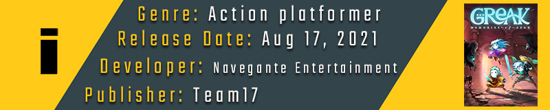 Δεν έχουν περάσει πολλές μέρες από τότε που το Greak: Memories of Azur έχει κυκλοφορήσει από την Team17. Πρόκειται για ένα Action Platformer που δεν ακούγεται τόσο τον τελευταίο καιρό, πράγμα λογικό αν σκεφτούμε πως μέσα στις διακοπές δύσκολα θυμόμαστε την ύπαρξη ορισμένων παιχνιδιών.