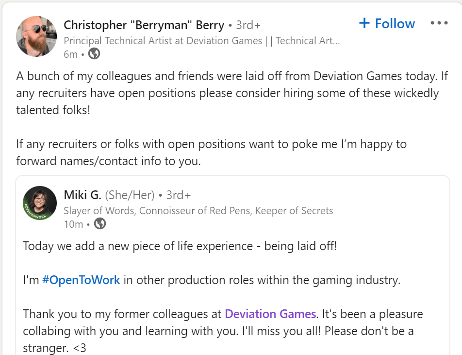 Η Deviation Games, ένα στούντιο που υποστηρίζεται από το PlayStation, φέρεται να έχει υποστεί έναν γύρο απολύσεων, οι οποίες ενδέχεται να φτάνουν έως και τους 90 υπαλλήλους. Κάποιοι πρώην υπάλληλοι της Deviation ανακοινώνουν στα μέσα κοινωνικής δικτύωσης την αποχώρησή τους από το στούντιο. Ο Kyle Perras, software engineer, αποκάλυψε ότι ήταν μέλος μιας ομάδας εργαζομένων που αφέθηκαν ελεύθεροι, μετά από μια δύσκολη κατάσταση που είχε αντιμετωπίσει το στούντιο. Πέρυσι, ένας από τους συνιδρυτές και chief creative officer, o Jason Blundell, αποχώρησε επίσης από την εταιρεία.