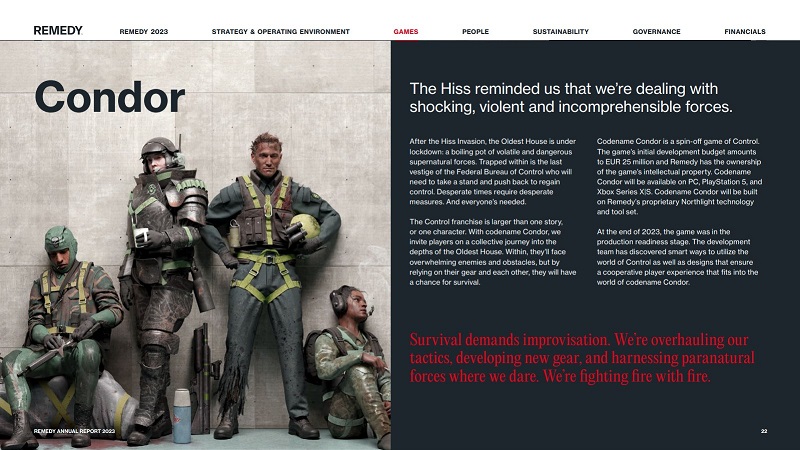 Μετά και τη κυκλοφορία του Alan Wake 2 η Remedy στρέφει τη προσοχή της στο επόμενο project της με κωδική ονομασία Condor. Πρόκειται για ένα spin-off Co-op Multiplayer του Control και θεωρείται το πρώτο βήμα του studio στα service-based παιχνίδια. Το παιχνίδι θα κάνει χρήση της Northlight μηχανής γραφικών και δεν θα είναι free-to-play.