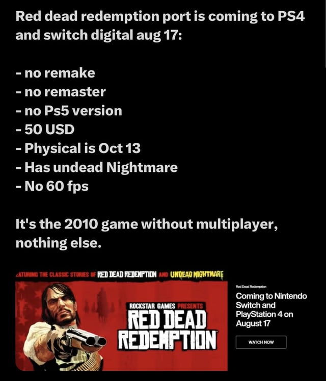 Αντί να εκμεταλλευτούν το αριστούργημα του Red Dead Redemption 2 κάνοντας το remastered έστω που κανονικά remake έπρεπε και να ενώσουν αυτές τις 2 υπέροχες ιστορίες σκέφτηκαν να πουλήσουν μασημένη κρυμμένη τροφή. Όχι αγάπη μου δεν θα πάρω ευχαριστώ αλλα τόσα χρόνια φούρναρης έχω ψήσει και μας έχεις ζημώσει, σε καμία συνδρομητική και σε καμία πτώση τιμής,