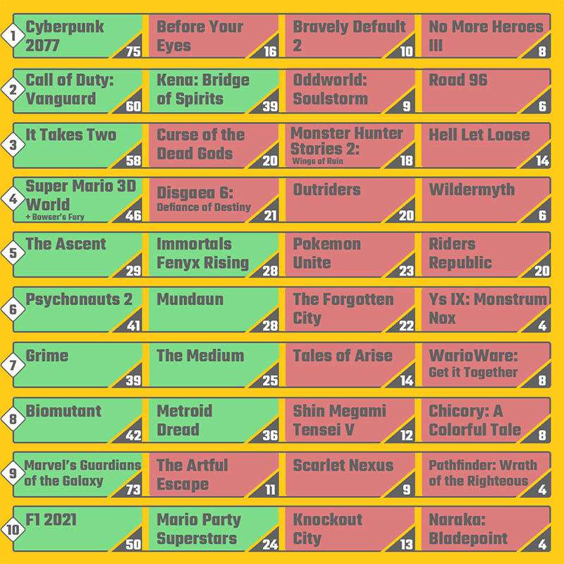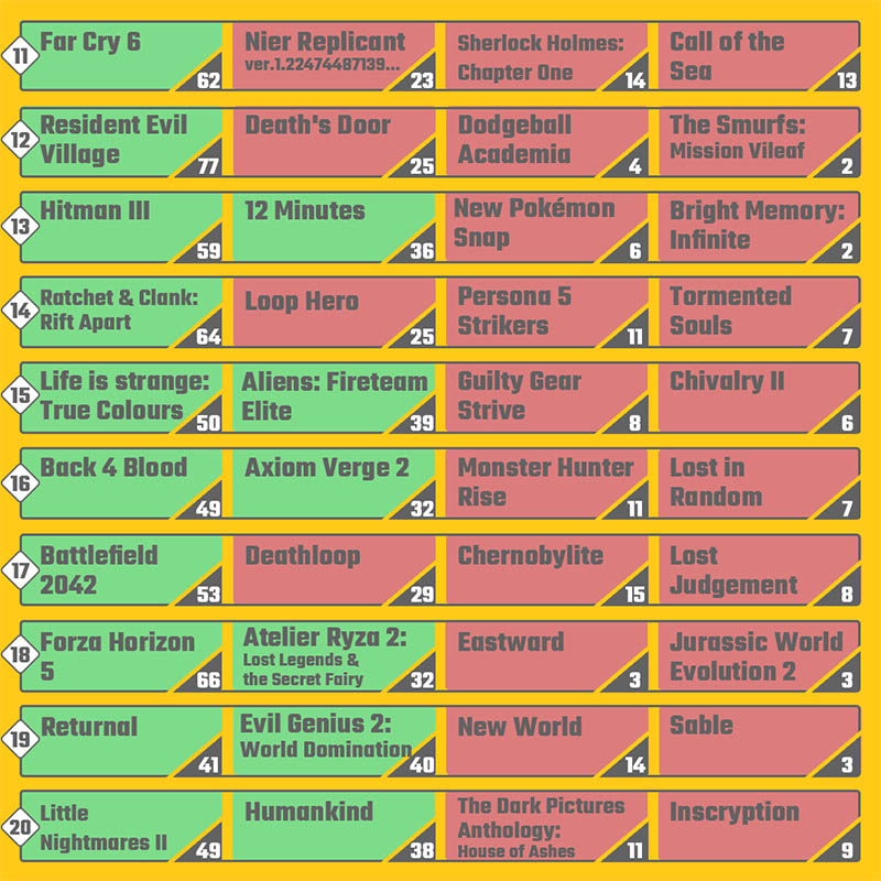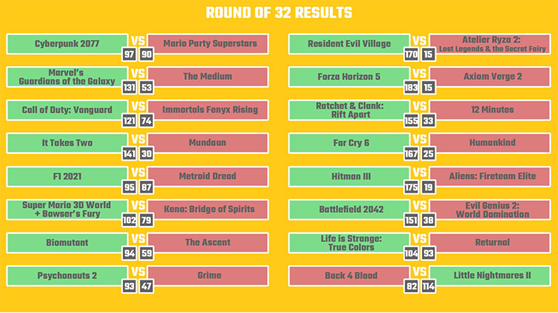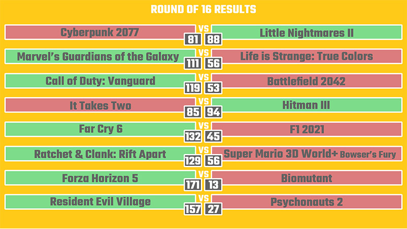 Περνάμε πλέον στην τελική φάση του διαγωνισμού με τις ημερήσιες αναμετρήσεις να μειώνονται στις 4. Αν και εδώ οι περισσότερες επικρατήσεις ήταν εμφατικές υπήρξαν περιπτώσεις όπως το “Cyberpunk 2077” και το “It Takes Two” που συγκέντρωσαν πάνω από 80 ψήφους αλλά αποκλείστηκαν με μονοψήφια διαφορά ψήφων. Ακολουθεί η τελική ταξινόμηση των παιχνιδιών που αποκλείστηκαν σύμφωνα με τις ψήφους που συγκέντρωσαν στον γύρο αυτόν.