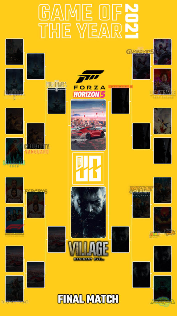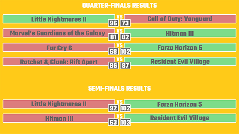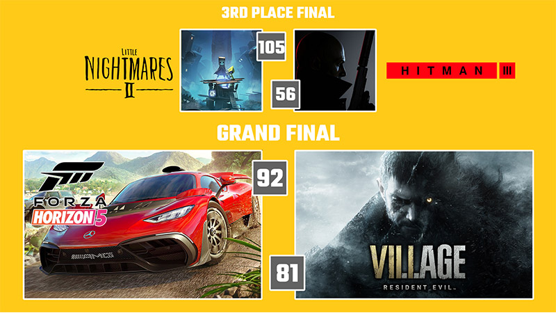 Πριν φτάσουμε στον μεγάλο τελικό αποφασίσαμε να διοργανώσουμε, όπως και πέρσι έναν μικρό τελικό για την τρίτη θέση, νικητής του οποίου αναδείχθηκε με εμφατική διαφορά το “Little Nightmares II” έναντι του “Hitman III”. Τέλος, ο μεγαλος τελικός όπως ήταν αναμενόμενο κρίθηκε στις λεπτομέρειες με το “Resident Evil Village” να χάνει το βραβείο για μόλις 11 ψήφους από τον μεγάλο νικητή του φετινού θεσμού, το “Forza Horizon 5”