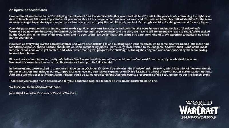 Σε ένα μήνυμα που δημοσιεύτηκε στα επίσημα φόρουμ του World of Warcraftσήμερα, ο εκτελεστικός παραγωγός John Hight ανακοίνωσε ότι το World of Warcraft: Shadowlands θα καθυστερήσει. Πόσο δεν το γνωρίζουμε ακόμα μιας και δεν έχει δοθεί ακριβής ημερομηνία, αλλά η αναμενόμενη κυκλοφορία παραμένει μέσα στο 2020 σύμφωνα με την ανάρτηση.