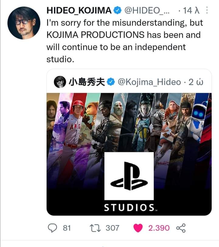 Και εφόσον έριξε το λάδι στη φωτιά μετά από καμιά ώρα, μας ζητάει συγγνώμη για την αναστάτωση και μας λέει ότι τελικά η Kojima productions θα παραμείνει ανεξάρτητο studio. Ο βασιλιάς της τρολιάς επέστρεψε δυναμικά!