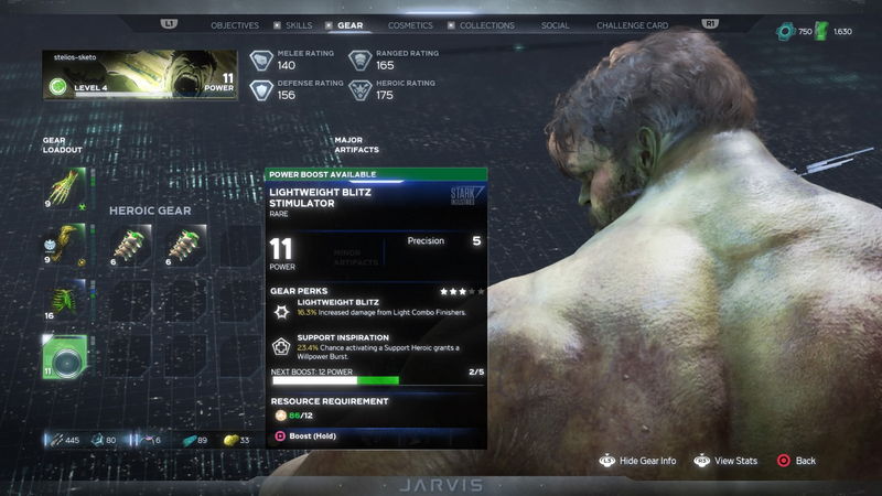 Όλοι οι χαρακτήρες διαθέτουν Skills και Special Heroics με τα πρώτα να αναπτύσσονται μέσα από ένα skill tree και τα δεύτερα να αποτελούν πιο σταθερές κινήσεις. Τα Special Heroics κατηγοριοποιούνται σε Support Heroic, Assault Heroic και Ultimate Heroic, διαθέτουν cooldown timer και ουσιαστικά είναι αυτές που θα χρησιμοποιήσετε ως επι το πλείστον μέχρι να αναπτύξετε περισσότερο τους χαρακτήρες σας. Είναι αδύνατον να αναλύσω όλα τα χαρακτηριστικά τους οπότε θα αναφέρω μόνο εκείνα που χρησιμοποίησα με τους δύο ήρωες που επέλεξα. Έτσι, ο Hulk για Support Heroic διαθέτει το «Boneshaker» με το οποίο προσελκύει τους αντιπάλους προς το μέρος του, για Assault Heroic βρίσκουμε το παρανοϊκό «Gamma Rush» όπου ο πράσινος και μόνιμα τσαντισμένος ήρωας αναπτύσσει ταχύτητα αρπάζοντας τον πρώτο που θα βρει μπροστά του καταλήγοντας να τον χτυπάει μανιωδώς στο έδαφος προκαλώντας στο τέλος της..διαδρομής stun σε όσους έχουν την ατυχία να βρίσκονται στον χώρο. Τέλος, το Ultimate Heroic του Hulk δε θα μπορούσε να είναι άλλο από το «Thunderclap» με το οποίο προκαλεί ωστικό κύμα χτυπώντας τις παλάμες του ακινητοποιώντας όποιον έρθει σε επαφή. Η Ms. Marvel διαθέτει στα αντίστοιχα Heroics τα «Healing Spirit» θεραπεύοντας πλήρως τον εαυτό της και σε κάποιο βαθμό τους συντρόφους της, το «High Five», shapeshifting χαστούκι προκαλώντας shockwave και, τέλος, το εξαιρετικό «Embiggen» με το οποίο χάρη στις πολυμορφικές της δυνατότητες μεταμορφώνεται σε γίγαντα προκαλώντας τεράστια ζημιά και παράλληλα επαναφέρει σε μικρό βαθμό το Willpower. Στο πεδίο της μάχης, εμφανίζονται συγκεκριμένες ενδείξεις πριν τις επιθέσεις προκειμένου να τις αποκρούσετε ή να τις αποφύγετε. Η αλήθεια είναι ότι στην αρχή και μέχρι να εξοικειωθείτε οι μάχες φαίνονται χαοτικές λόγω του όγκου της πληροφορίας που δέχεστε αλλά γρήγορα θα ενεργοποιηθούν τα αντανακλαστικά σας και θα τις απολαύσετε.