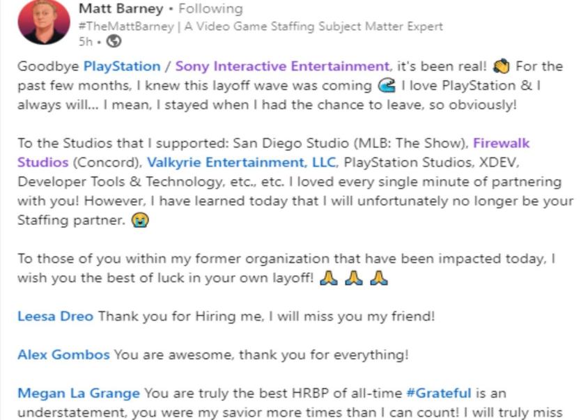 Ο Matt Barney ήταν Senior Technical Recruiter στο Playstation. Στην ανάρτηση του αναφέρει ότι τους τελευταίους μήνες ανέμενε το κύμα απολύσεων. Επίσης ανέφερε την αγάπη του για το PlayStation που ήταν και ο λόγος για τον οποίο έμεινε στην εταιρία ακόμα και όταν είχε την ευκαιρία να φύγει.