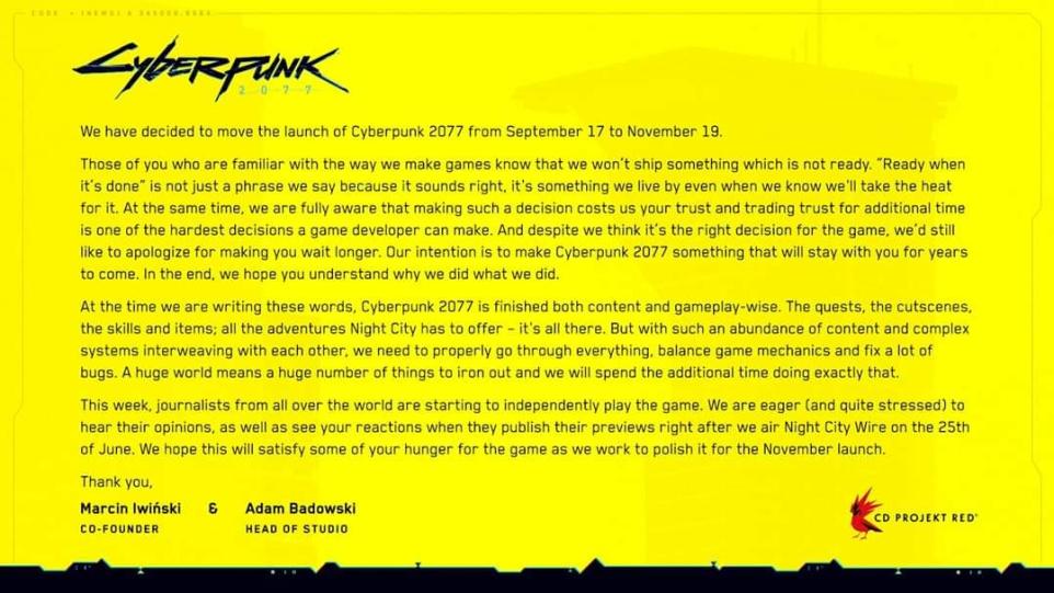 Το Cyberpunk 2077 κυκλοφορεί εκτός απροόπτου την 19η Νοεμβρίου για PC, PS4, XBOX One. Όσοι αποκτήσουν το παιχνίδι για τις παραπάνω κονσόλες, θα έχουν τη δυνατότητα να το παίξουν και στις διαδόχους αυτών, PS5 και Xbox Series X αντίστοιχα χωρίς κάποια επιβάρυνση.