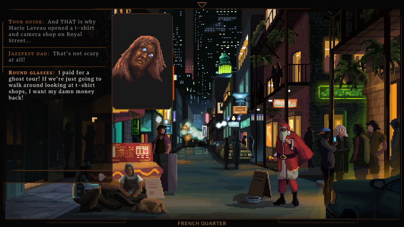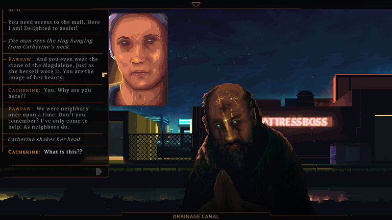 Η θρησκεία και οι παραφυάδες της, προφήτες των δρόμων, αστικοί νομάδες, ματαιόδοξοι ιδιωτικοί ντετέκτιβ, ερημίτες και τρομοκράτες, απατεώνες και τυχοδιώκτες, η τεχνολογία της καθημερινότητας απαρτίζουν το προσκήνιο μέσα στο οποίο θα κινηθείτε. Σειρήνες της αστυνομίας στα υποβαθμισμένα προάστια και σοκάκια, υγρές γροθιές είτε από το αίμα είτε από τη βροχή, μετρό και λεωφορεία σε ατέρμονη κίνηση, επιβάτες που φαινομενικά παρατηρούν τη διαδρομή μέμφονται το είδωλό τους στο παράθυρο. Όλα τα παραπάνω αποτυπώνονται εξαιρετικά μέσα από το pixel art, τη μουσική και ηχητικά εφέ που πρέπει να τα ακούσετε για να αντιληφθείτε το επίπεδο της σχολαστικής δουλειάς που έγινε. Φωνητικά δεν υπάρχουν αλλά αυτό δεν αφήνει την εμπειρία λειψή. Οι χαρακτήρες που θα συναντήσετε είναι αξιομνημόνευτοι. Ο καθένας έχει τη δική του ενδιαφέρουσα ιστορία και πολλές φορές η εξιστόρηση μοιάζει πολυφωνική δίχως, δηλαδή, να υφίσταται κεντρικός χαρακτήρας.