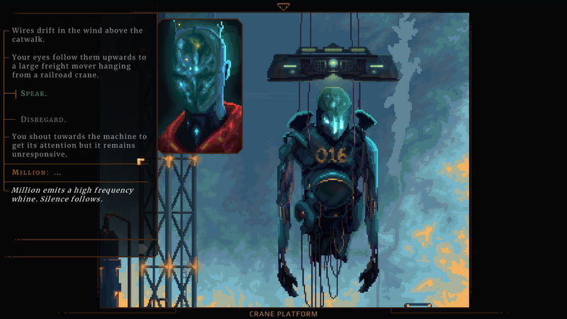 Για τελευταίο αφήνω συνειδητά τους διαλόγους και γενικότερα το κείμενο. Χωρίς να φλυαρήσω περισσότερο, ετοιμαστείτε για ένα αψεγάδιαστο κείμενο, μια γλώσσα ιδιαίτερη την οποία πράγματι συναντούμε σε αντίστοιχα λογοτεχνικά κείμενα ή ακόμα και στον κινηματογράφο. Σιλουέτες και φιγούρες εμφανίζονται στο σκοτεινό γραφικό παρασκήνιο κάτω από επιγραφές neon δίνοντας έτσι μια επιμελή δόση tech-noir, ερειπωμένα mall, συνοικιακά μπαρ με νηφάλιους από την πραγματικότητα θαμώνες, καταστήματα με αναμνηστικά της κουλτούρας του Νότου, πλανόδιοι χαρτομάντεις, performers της hoodoo, μολυσμένα bayou, ηθοποιοί του δρόμου. Το χιούμορ των κειμένων δεν είναι για όλους· κυνικό, ειρωνικό, ριζοσπαστικό απέναντι στον ψηφιακό (και όχι μόνο) μικρόκοσμο του Norco θραύει θρασύτατα τον τέταρτο τοίχο απευθυνόμενο στον μακρόκοσμο του «πραγματικότητας» του παίχτη. Σχεδόν μυθολογικού τύπου τραγικοί χαρακτήρες και ήρωες που ενσαρκώνουν το ιδεώδες της ευθύνης και της αυτοθυσίας, της πτώσης και της παρακμής κόντρα στο ένστικτο της επιβίωσης και την ειμαρμένη, αναζητώντας την ελπίδα, εξυπηρετώντας την αρχέγονη τάση του ανθρώπου για την ευτυχία. Ο μυστικισμός αιωρείται πάνω από αυτό το τεχνολογικά υποταγμένο περιβάλλον. Οι αρχαϊκές θρησκείες και τα έθιμα με τους ξέφρενους χορούς και τις ικεσίες έχουν καταγραφεί στο μνημονικό του σώματος. Θα ολοκληρώσω σε αυτό το σημείο με όσα περιγράφονται στο «About» section της ιστοσελίδας των δημιουργών που συνοψίζει τα παραπάνω: «Geography of Robots is a collection of games, interactive fiction, and other experiments that explore the hidden geographies, conspiracies, folklore, and environmental histories of the American South».
