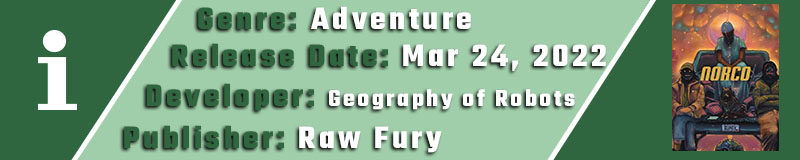 Το Norco με εξέπληξε πολύ πολύ ευχάριστα. Μια άρτια δομημένη ιστορία, αξιομνημόνευτους χαρακτήρες, εξαιρετικό γραφικό και ηχητικό περιβάλλον. Η Geography of Robots μας έδωσε ένα εξαιρετικό narrative point and click adventure που αντιμετωπίζει την πραγματικότητα με κυνισμό, πίσω από τον οποίο φανερώνεται η αγάπη για τη ζωή.