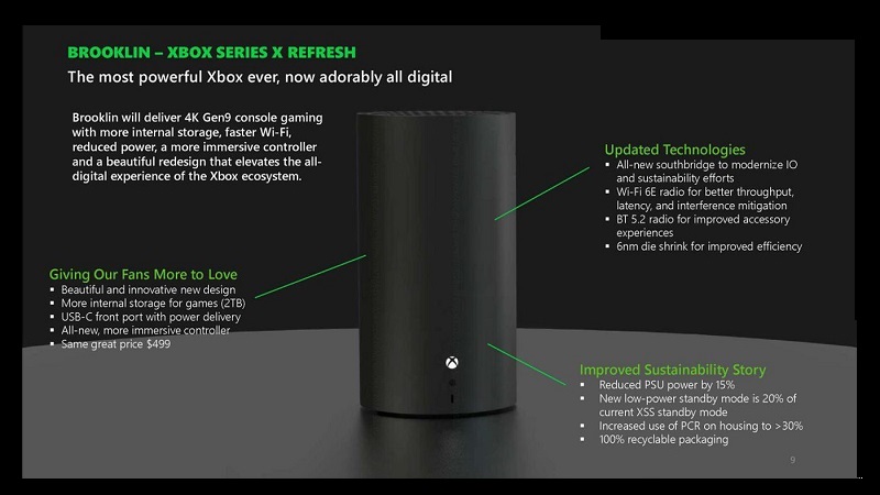 Όπως όλα δείχνουν η Microsoft θα κυκλοφορήσει ανανεωμένες εκδόσεις των κονσολών της μέσα στο επόμενο έτος. Το νέο Xbox Series X, με κωδική ονομασία Brooklin, θα είναι πιο συμπαγές από το αρχικό μοντέλο και δεν θα διαθέτει μονάδα disc drive. Η διαρροή αποκαλύπτει επίσης ότι αυτή η κονσόλα θα διαθέτει 2TB αποθηκευτικού χώρου και 16GB μνήμης RAM και θα διατίθεται σε 100% ανακυκλώσιμη συσκευασία. Η ενημερωμένη έκδοση του Series S θα έχει τη κωδική ονομασία Ellewood και θα διαθέτει επίσης ανανεωμένα χαρακτηριστικά. Η Micorsoft φαίνεται να σχεδιάζει να ακολουθήσει την ίδια τιμολογιακή πολιτική για τις νέες κονσόλες. Η διαρροή επίσης αναφέρει ότι και οι δύο κονσόλες θα ανακοινωθούν ταυτόχρονα το επόμενο καλοκαίρι, με το Ellewood να κυκλοφορεί τον Αύγουστο του 2024 και το Brooklin να κυκλοφορεί τον Οκτώβριο του 2024.