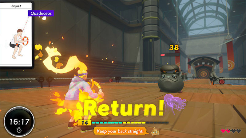 Πέρα από την περιήγηση σε κάθε πίστα θα αντιμετωπίσουμε και διάφορα πλασματάκια σε turn-based μάχες. Ακόμα και εδώ οι επιθέσεις ή η άμυνα γίνεται μέσω κάποιου είδους άσκησης. Για παράδειγμα, στην αρχή είχα 3 ασκήσεις που με έβαζαν να γυμνάσω πόδια, κοιλιακούς ή πλάτη με δικέφαλους. Σε κάθε επίθεση υπάρχει μια ένδειξη στην οθόνη που μας κατευθύνει για το πως πρέπει να γίνεται η άσκηση ενώ τα “Hold” και “Release” μας βοηθάνε στο να κάνουμε πιο σταθερές και αποτελεσματικές επαναλήψεις προκαλώντας και μεγαλύτερη ζημιά στους εχθρούς.