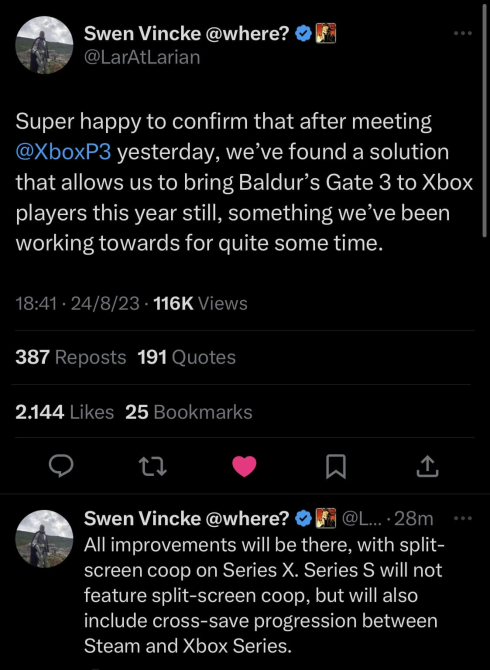 Συγκεκριμένα ο πρόεδρος της Larian Studios Swen Vincke δήλωσε ότι βρέθηκε λύση μετά τη συνάντηση του με στελέχη τoυ Xbox Division για την κυκλοφορία του Baldur’s Gate 3.