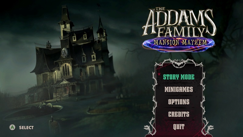 Ξεκινώντας το παιχνίδι μεγάλη έκπληξη μου κάνει η απουσία του εικονικού μουσικού θέματος της Οικογένειας Άνταμς παρόλο που στους τίτλους αρχής φαίνεται το ότι οι δημιουργοί του παιχνιδιού έχουν όλες τις απαραίτητες άδειες χρήσης. Παρόλα αυτά ένα αρκετά συμπαθητικό μουσικό θέμα με καλώς ορίζει στο αρχικό μενού. Story Mode, Mini Games, Options και Credits είναι οι αρχικές μας επιλογές. Τα Options του παιχνιδιού περιορίζονται στην ρύθμιση του ήχου, την επιλογή γλώσσας και στην ρύθμιση των controls. Στην επιλογή Mini Games δεν υπάρχει τίποτα μιας και πρώτα πρέπει να ξεκλειδώσεις τα μίνι παιχνίδια παίζοντας το Story Mode.