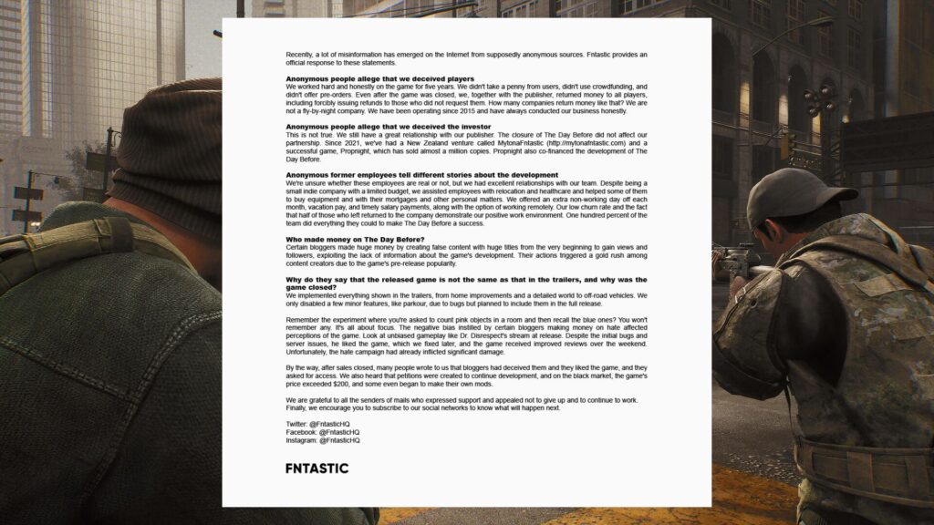 Δύσκολα μπορεί κανείς να ξεχάσει το φιάσκο του The Day Before. Μέσα στο Δεκέμβριο, και μόλις λίγες μέρες μετά τη κυκλοφορία του παιχνιδιού, το studio ανάπτυξης Fntastic ανακοίνωσε ότι κλείνει λόγω έλλειψης οικονομικών πόρων. Φυσικά η κατακραυγή του gaming κοινού ήταν μεγάλη μπροστά σε αυτή την απάτη.