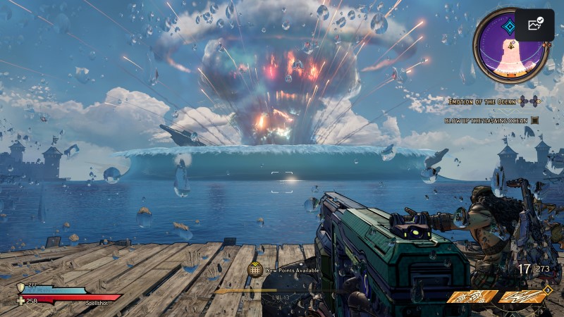 Το Tiny Tina’s Wonderlands ανήκει στην κατηγορία Looter-Shooter παιχνιδιών. Σκοπός του παιχνιδιού λοιπόν (εκτός του να τελειώσεις την κεντρική ιστορία του) είναι και το να βρεις το δυνατότερο όπλο που θα εξαϋλώσει όλους τους εχθρούς. Εδώ λοιπόν το παιχνίδι δεν σε απογοητεύει. Το shooting είναι απολαυστικό και κάθε όπλο που χρησιμοποιείς μοναδικό και ευφάνταστο. Υπάρχουν κάποιες βασικές κατηγορίες όπλων (Pistol, SMG, Assault Rifle, Sniper κλπ) αλλά από εκεί και πέρα ο μόνος περιορισμός είναι η φαντασία. Όλα τα όπλα του παιχνιδιού έχουν τυχαία στατιστικά και ιδιαιτερότητες και είναι σχεδόν αδύνατο να βρεις το ίδιο όπλο δύο φορές. Επίσης δεν πρέπει να ξεχάσω να αναφέρω ότι τα όπλα μπορούν να έχουν και διαφορετικές λειτουργίες. Ένα sniper για παράδειγμα μπορεί να αλλάζει την λειτουργία του και να γίνεται shotgun. Ο σχεδιασμός των όπλων είναι και αυτός εκπληκτικός. Οι λεπτομέρειες που έχει το κάθε ένα σε κάνει σταματάς και να τα παρατηρείς.