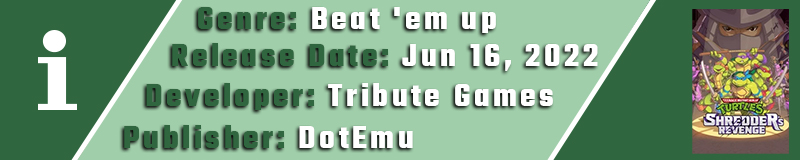 Οι Leonardo, Raphael, Michelangelo, και Donatello οι οποίοι δανείστηκαν τα ονόματά τους από τους θρυλικούς καλλιτέχνες της Αναγέννησης επιστρέφουν σε ένα ακόμα beat ‘em-up παιχνίδι με τίτλο Teenage Mutant Ninja Turtles: Shredder’s Revenge από την ταλαντούχα ομάδα της Tribute Games η οποία μας έχει χαρίσει indie αριστουργήματα όπως τα Flinthook, Steel Assault, Panzer Paladin και Mercenary Kings, παιχνίδια που έχουν ως κοινό τους χαρακτηριστικό τα άριστα pixel γραφικά τους.