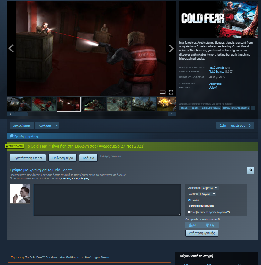 Χωρίς καμία προειδοποίηση, το Cold Fear (κυκλ. 2005) αφαιρέθηκε από τον κατάλογο του Steam (παραμένοντας διαθέσιμο μόνο για όσους το είχαν αποκτήσει ήδη – είτε προμηθευτούν κάποιο ‘κλειδί’ εκτός steam), λίγους μήνες μετά την εξαγορά των δικαιωμάτων του από την Atari.