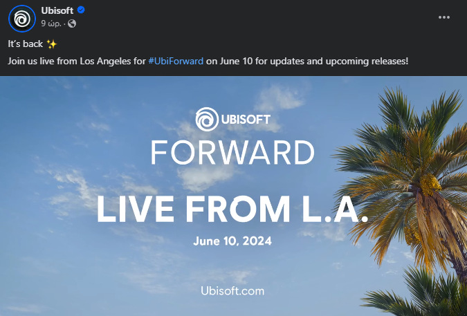 Η εταιρεία ανακοίνωσε ότι το νέο Ubisoft Forward-event της θα πραγματοποιηθεί στο σύνηθες παραθυράκι, όπου λίγο πολύ θα λέγαμε ότι ψιλοπεριμέναμε, για τις αρχές Ιουνίου και συγκεκριμένα το τοποθετεί στις – 10 του μηνός.