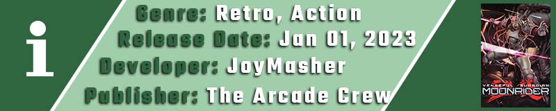 Το Vengeful Guardian: Moonrider είναι ακόμα ένα νοσταλγικό ταξίδι αφού οι επιρροές του εντοπίζονται σε τίτλους όπως τα Shinobi και Strider – παιχνίδια που το SEGA GameGear τίμησε δεόντως. Αυτή την φορά πρόκειται για ένα action-platformer επιστημονική φαντασίας στο οποίο λαμβάνουμε τον ρόλο του Moonrider, ενός ρομποτικά ενισχυμένου ninja που απαρνείται τον σκοπό του να διατηρήσει το απολυταρχικό καθεστώς του κόσμου με αποτέλεσμα να ξεκινάει έναν πόλεμο ενάντια στους δημιουργούς του. Θα πρέπει να εξερευνήσουμε 8 διαφορετικά επίπεδα, να αντιμετωπίσουμε όλους τους εχθρούς και τα αφεντικά που μας περιμένουν και να φτάσουμε στον τελικό αρχηγό ώστε να βάλουμε ένα τέλος στο καθεστώς που έχει δημιουργήσει.