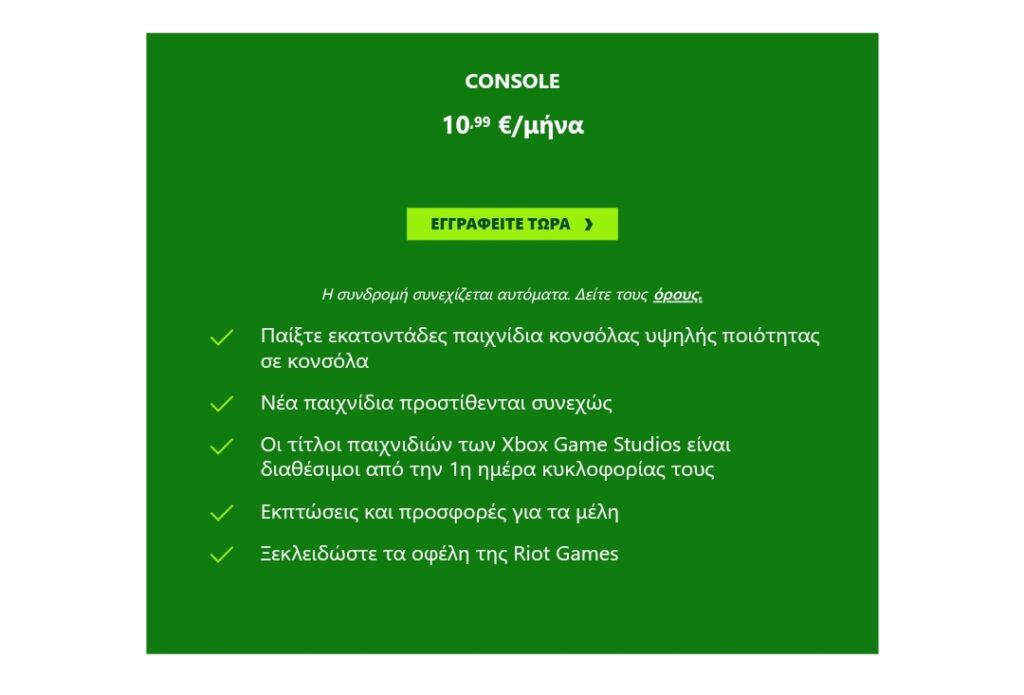 Όπως μπορείτε να δείτε μετά το πέρας των 14ων ημερών θα πρέπει να καταβάλετε όπως ήταν και πριν ανά μήνα το ποσό των 9.99€ για το PC Game Pass και 14.99€ για το Game Pass Ultimate αντιστοίχως, ώστε να συνεχίσετε να χρησιμοποιείτε την συνδρομητική υπηρεσία. Θα παρατηρήσατε η τιμή απόκτησης του απλού πακέτου Console Game Pass, το οποίο όπως προδίδει και το όνομα του προσφέρει πρόσβαση στα οφέλη της υπηρεσίας μόνο για Xbox κονσόλες, παραμένει ανεπηρέαστη καθώς έτσι κι αλλιώς δεν προσφερόταν κάποια δοκιμαστική περίοδος γνωριμίας σ’ αυτό.