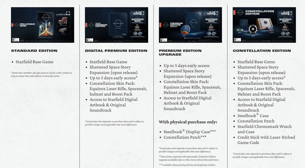 Το ταξίδι προς τα άστρα ξεκινά πρόωρα αυτή τη Παρασκευή, 1η Σεπτεμβρίου μόνο σε Xbox Series X/S και PC (Steam / Windows Store) για όσους έχουν προβεί σε προπαραγγελία της Premium έκδοσης, είτε της Premium edition επιλογής αναβάθμισης της απλής, ή της Constellation Edition. Με τους κατόχους της βασικής -standard- έκδοσης και τους Game Pass συνδρομητές να ακολουθούν στις 6 του μηνός τη κανονική ημερομηνία κυκλοφορίας.